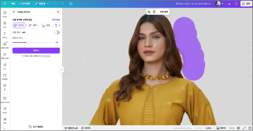 "Magic Eraser" 화면에서 브러시 크기를 조절하고 확대(줌)해서 살짝 삐져나온 부분을 지우거나 되살립니다.