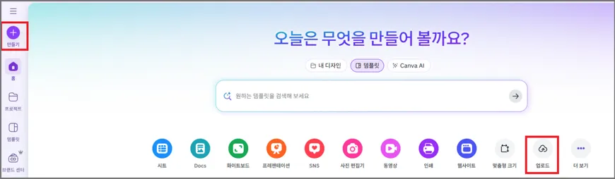2) 캔바 앱이나 캔바 웹페이지에 로그인 한 후 "만들기"를 클릭하여 새 디자인을 만들 후 좌측 영역의 "업로드" 버튼을 클릭하거나 캔바 웹페이지 시작 화면에서 "업로드" 버튼을 클릭하여 배경을 삭제할 이미지를 업로드 합니다.