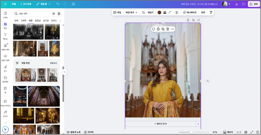 또 다른 방법은 디자인 화면 좌측 영역에서 "업로드 항목"를 눌러 사진을 업로드 한 후 디자인 화면에 끌어 놓고 상단의 "배경 제거" 버튼을 누릅니다. 몇 초 뒤, 배경이 자동으로 사라집니다. 끝!