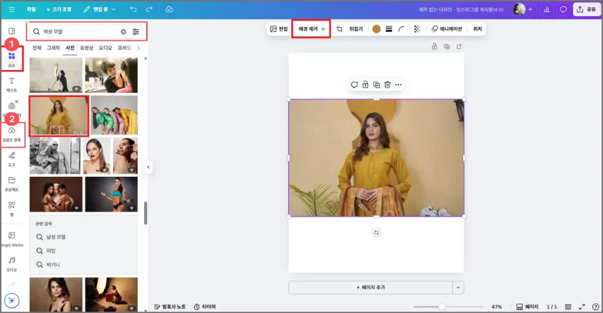 3) 새로운 디자인 화면에서 좌측 메뉴에서 "요소"를 눌러 이미지를 검색하여 조회한 후 디자인 화면에 드래그하거나 더블 클릭하세요. 그리고 디자인 화면 상단의 "배경 제거" 버튼을 누릅니다.
