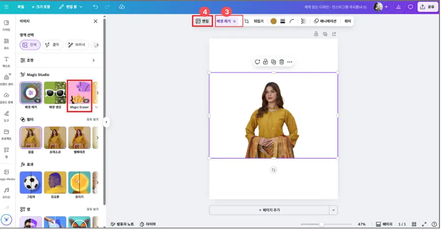 4) 배경을 삭제한 후 디자인 화면 상단의 "편집" 버튼 클릭 → 좌측 영역의 Magic Studio 영역의 "Magic Eraser" 눌러 이미지를 보정할 수 있어요.