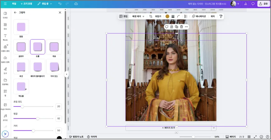 6) 더 멋지게 보이게 하려면 디자인 화면 상단의 "편집" 버튼을 클릭하여 왼쪽 영역의 fx효과 "그림자"를 선택하여 드롭 또는 글로우를 살짝 적용해 보세요.