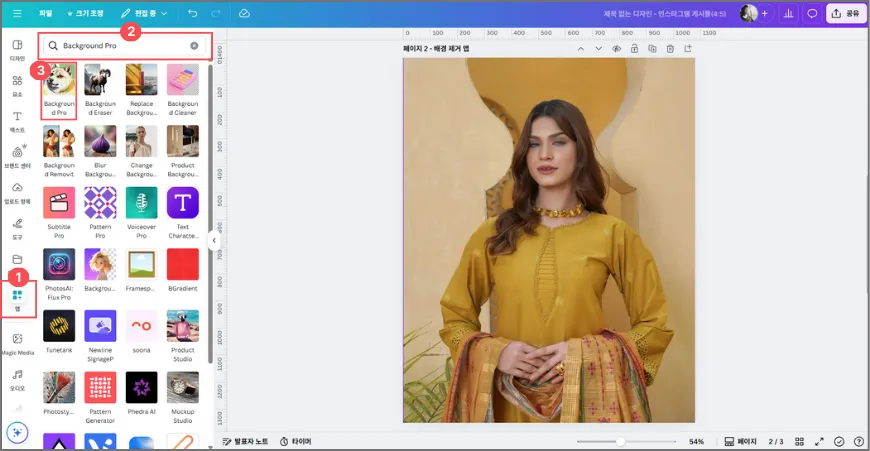 1) 캔바 화면 좌측 영역의 "앱" 메뉴 클릭 → 검색 창에 "background Pro" 입력하여 조회 → "background Pro" 앱 선택