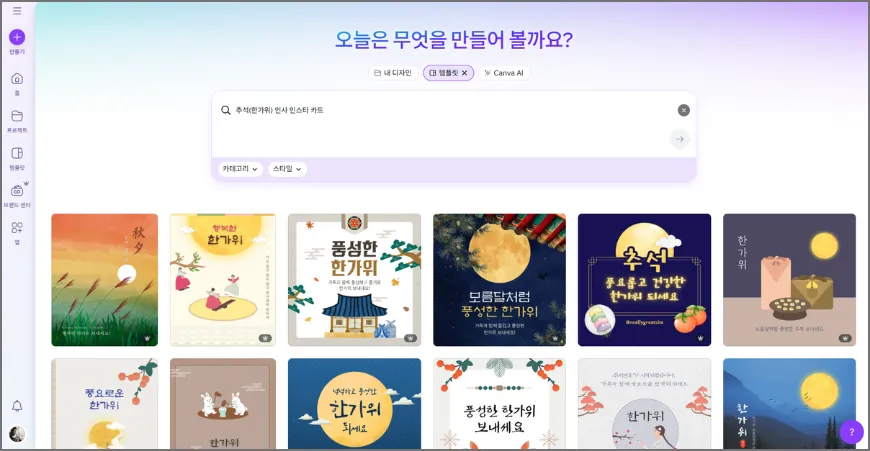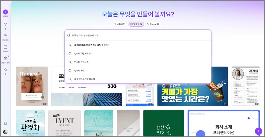 1) 캔바 홈에서 상단 검색창을 누르고, 만들고 싶은 것을 써 주세요.