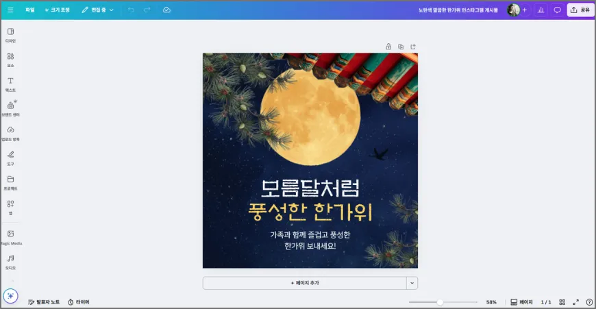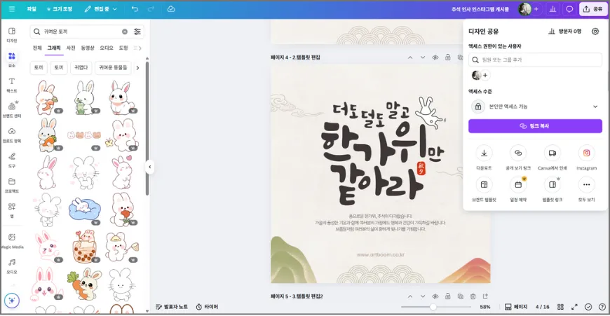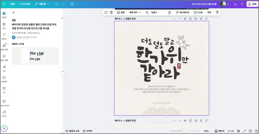 3) 템플릿이 마음에 들지 않으면 왼쪽의 디자인 메뉴를 눌러 또 다른 템플릿을 검색하여 선택합니다.