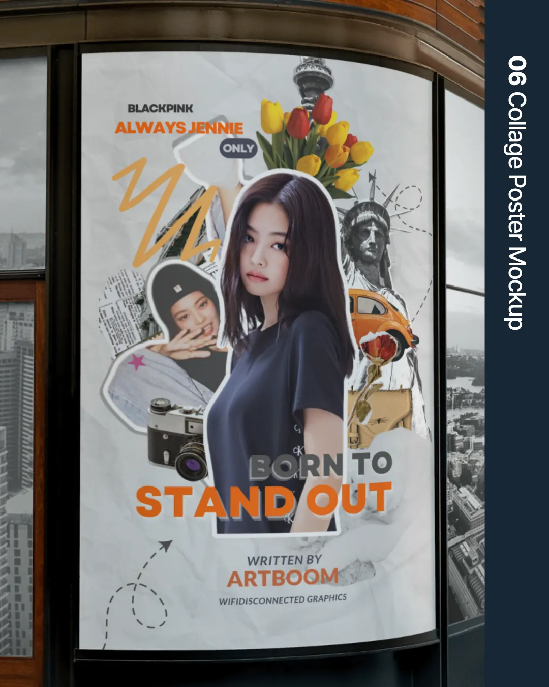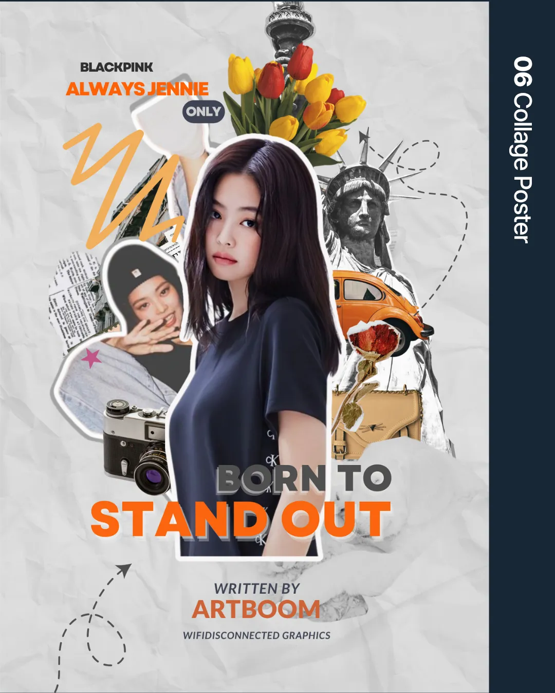 이 포스터는 인물 사진과 다양한 그래픽 요소를 조합해 감성적이고 자유로운 분위기를 연출하는 디지털 콜라주 스타일의 포스터 디자인입니다. 블랙핑크의 제니를 주제로 사진 조각, 타이포, 오브제들이 섹션별로 레이어되어 하나의 비주얼 스토리를 구성하였습니다.