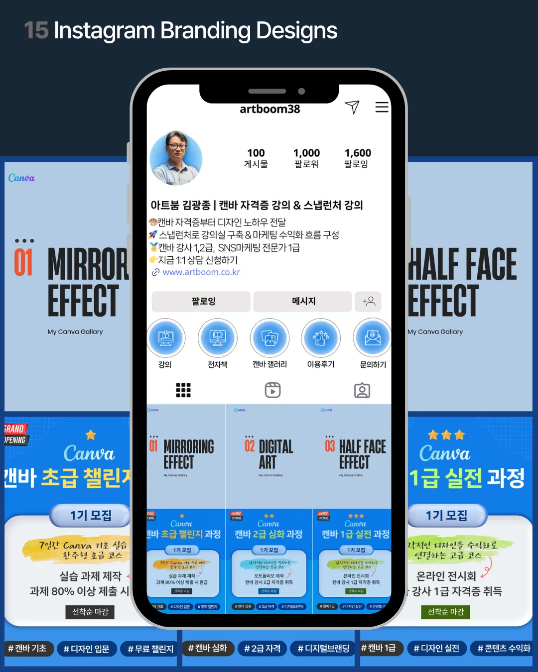 강의·전자책·갤러리·후기·문의’ 하이라이트를 일관된 아이콘·색으로 정보 구조를 통일하였으며, 커버 디자인을 한 시스템(아이콘/색/텍스트)으로 맞추었습니다.