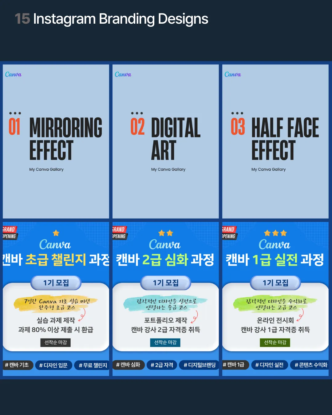 01/02/03 카드로 챕터형 커버를 깔고, 아래에 ‘모집 · 심화 · 실전’ 포스터를 연결해 행(row) 단위로 주제·톤을 맞춘 구성. 색 팔레트·타이포를 고정하면 프로필 방문자가 한눈에 커리큘럼과 브랜드 톤을 인지합니다.