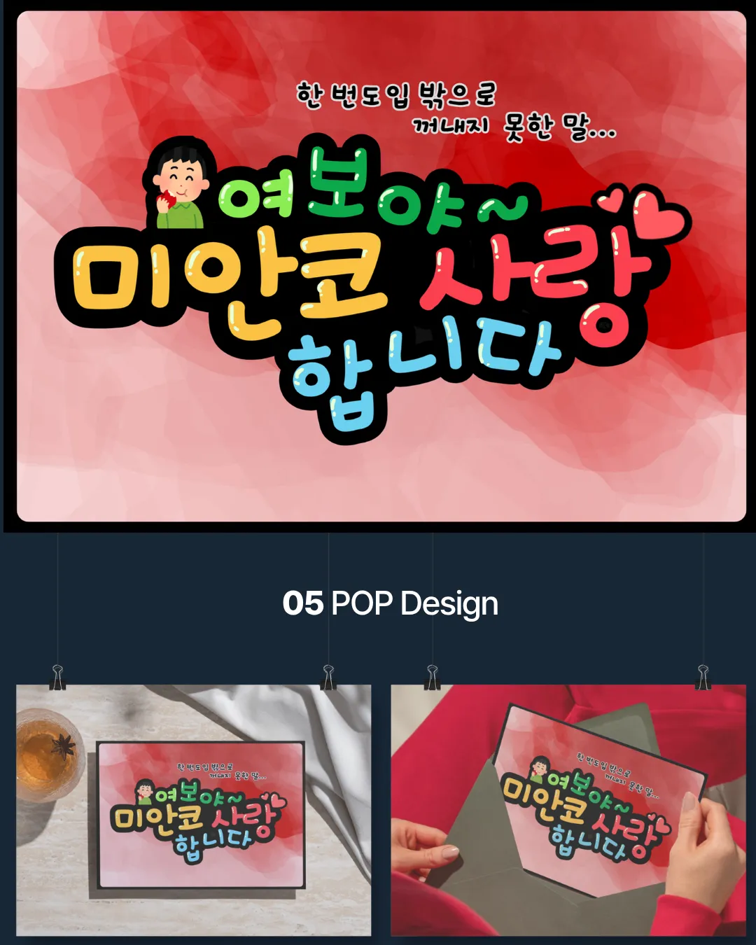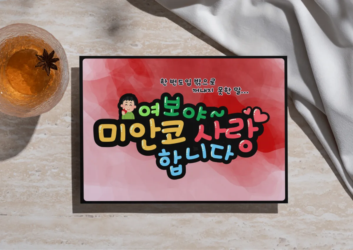 화사한 수채 배경 + 큰 글씨로 표현된 한글 문구 “여보야~ 미안코 사랑합니다”는 그동안 말로 표현하지 못한 아내에 대한 미안한 마음을 POP 사인이나 레트로 감성의 개성적인 디자인을 적용한 작품입니다.