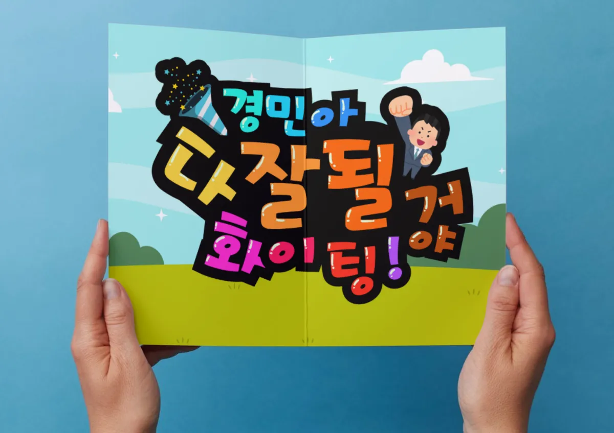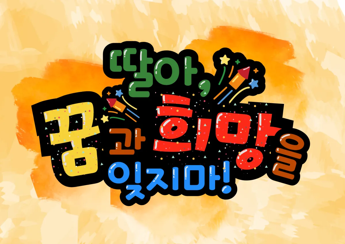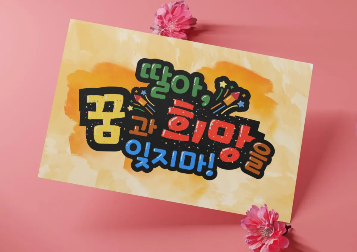 폰트는 둥글고 부드러운 터치의 팝 스타일로, 노랑·초록·파랑·빨강 등 밝고 채도가 높은 컬러 조합으로 귀엽고 유쾌한 무드를 연출하려 하였습니다.